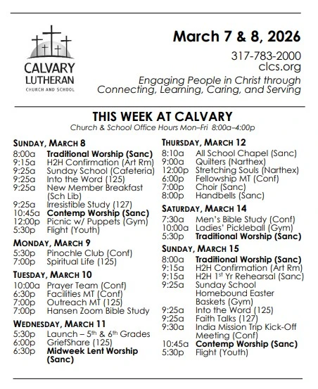 Pick up your copy of this year’s Lenten devotional booklet from Lutheran Hour Ministries, as we prepare for the joys and sorrows of Holy Week. The devotionals can be found at the ministry tables near the welcome center. The LHM devotions will also be available through Calvary’s Daily Devotions email.